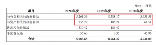 资料显示,2018年至2020年公司与收益相关的政府补助分别为3633.53万元、8588.17万元、5261.39万元,与资产相关的政府补助金额分别为61.51万元、186.24万元、336.27万元,合计来源政府补助金额分别为3695.04万元、8774.41万元、5597.66万元,分别占同期净利润比分别为34.89%、53.85%、30.89%,占比均超过30%,2019年占比甚至超过50%,存在依赖情况。