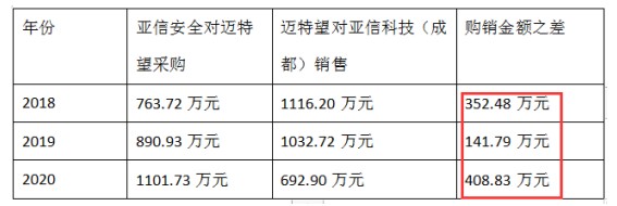 据南京迈特望2018年、2019年、2020年报披露,对公司全资子公司亚信科技(成都)有限公司销售金额分别为1116.20万元、1032.72万元、692.90万元。与公司对南京迈特望采购金额之差分别为352.48万元、141.79万元、408.83万元,出现购销不一致情况,到底哪家财务数据是真是假呢?