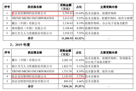在公司供应商中,有一个供应商较为诡异。 南京亚信智能网科技有限公司2019年、2020年分别为公司第四、第一大供应商,公司对其采购金额分别为1143.93万元、2724.41万元,分别占同期采购总额比为5.73%、10.44%。