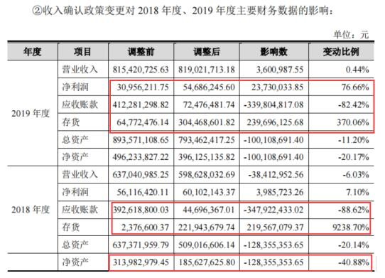 2018年,公司对营业收入调整金额3841.30万元,调节幅度6.03%,应收账款调节34792.24万元,调节幅度为88.62%,存货调节21956.71万元,调节幅度为9238.70%,净资产调节12835.54万元,调节幅度40.88%。2019年,公司调节净利润2373.00万元,调节幅度76.66%,应收账款调节33980.48万元,调节幅度82.42%,存货调节23969.61万元,调节幅度370.06%。