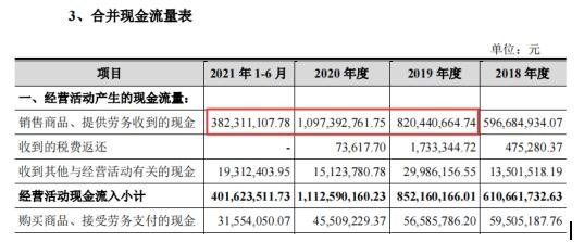 在公司在现金流量表中披露,2019年至2021年1-6月销售商品、提供劳务收到的现金金额分别为82044.07万元、109739.28万元、38231.11万元。同期,披露预收款项(合同负债)金额分别为17129.82万元、13588.11万元、15502.24万元,分别较上期增加3584.81万元、-3541.71万元、1914.13万元。因此,需要考虑其在现金流量中的影响,综合预收的影响,2019年至2021年1-6月流入与营收相关现金流金额为78459.26万元、113280.99万元、36316.98万元。