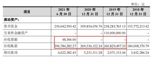 据招股书披露,2019年至2021年1-6月应收票据分别为0万元、0万元、4.83万元,应收账款分别为26082.95万元、26953.61万元、39678.43万元,应收票据及应收账款项合计分别为26082.95万元、26953.61万元、39683.26万元。分别较上期应收之和仅增加7682.09万元、870.66万元、12724.82万元,分别较上述含税收入与现金流勾稽出的数据少了6467.65万元、11959.18万元、2590.81万元。