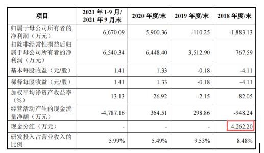 招股书披露,报告期各期末,公司其他应付款构成情况表中披露,2018年、2019年末公司应付股利金额为分别3198.43万元、2198.43万元,合计应付股利金额为5396.86万元,高于公司前面披露现金分红4262.20万元。