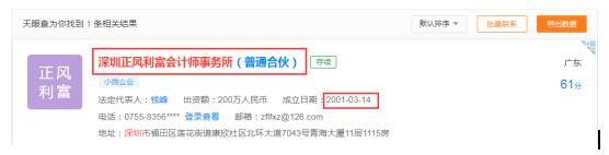 招股书披露,戴岚在1997 年 5 月至 1998 年 2 月任职于深圳正风利富会计师事务所(普通合伙)。而天眼查显示,深圳正风利富会计师事务所成立于2001年03月14日,那么戴岚是如何在深圳正风利富会计师事务所未成立之前4年便在该公司任职呢?极有可能是戴岚履历信息存在虚假披露,这明显与注册制之下科创板信披要求不相符。