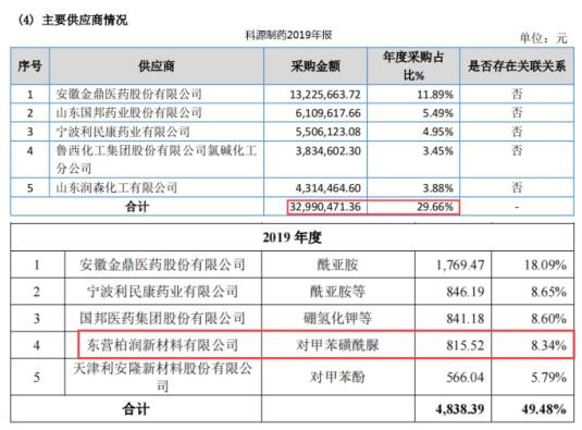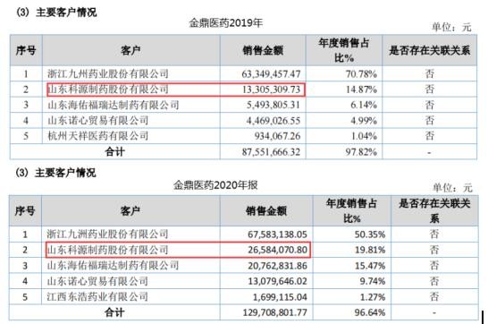 科源制药招股书披露,2019年、2020年公司对第一大供应商安徽金鼎医药股份有限公司采购酰亚胺金额分别为1769.47万元、3966.37万元,分别占同期采购总额比为18.09%、32.35%。而在安徽金鼎医药股份有限公司2019年、2020年报中披露,对第二大客户山东科源制药股份有限公司采购金额分别为1330.53万元、2658.41万元,与科源制药采购之间分别存在438.94万元、1307.96万元。