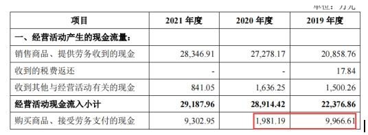 在上述采购总,2020年公司在含税采购金额为13853.08万元的情况之下,现金流量表中披露购买商品、接受劳务支付的现金仅为1981.19万元,金额相差非常悬殊。