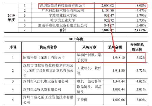 固高科技招股书披露,2019年对第一大客户深圳新益昌科技股份有限公司销售金额为2000.02万元,占据当期营业收入比为8.08%。而在深圳新益昌科技股份有限公司招股书中披露,其对固高科技采购金额为1948.10万元,与公司销售金额之差为51.92万元。