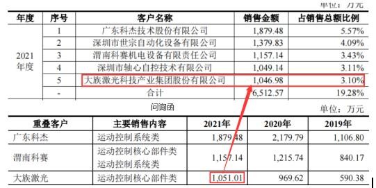 固高科技招股书披露,2021年对第五名客户大族激光科技产业集团股份有限公司(下称“大族激光”)的销售金额为1046.98万元,占销售总额的比例为3.10%。但是,在问询函中却披露,2021年公司对客户大族激光科技产业集团核心部件产品的金额为1,051.01万元,销售金额之差为4.03万元。
