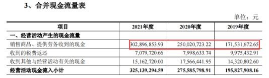 固高科技招股书披露,2019年至2021年对前五大客户销售金额合计分别为5809.07万元、6958.15万元、6512.57万元,分别占同期营业收入比为23.47%、24.59%、19.28%,由此可计算出营业收入分别为24751.04万元、28296.67万元、33778.89万元。根据最低13%销售增值税计算,则公司应收到含税营收金额分别为27968.68万元、31975.23万元、38170.15万元。上述含税营业收入在财务报表中将体现为同等规模的现 金流量流入和应收账款及应收票据等经营性债权的增减。