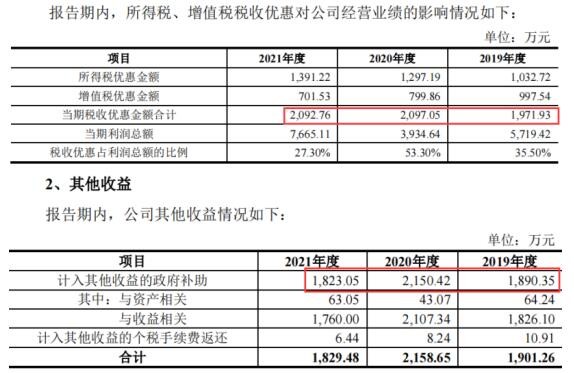 固高科技招股书披露,2019年至2021年,公司来自于税收优惠金额合计分别为1971.93万元、2097.05万元、2092.76万元,同期利润总额分别为5719.42万元、3934.62万元、7665.11万元,税收优惠金额分别占同期利润总额比为35.50%、53.30%、27.30%,其中2020年占比一度超过5成。
