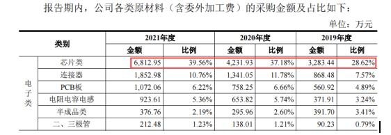 固高科技招股书披露,报告期内公司对芯片类采购金额分别为3283.44万元、4231.93万元、6812.95万元,分别占同期采购总额比为28.62%、37.18%、39.56%,采购占比逐年上升,成为公司主要原材料。