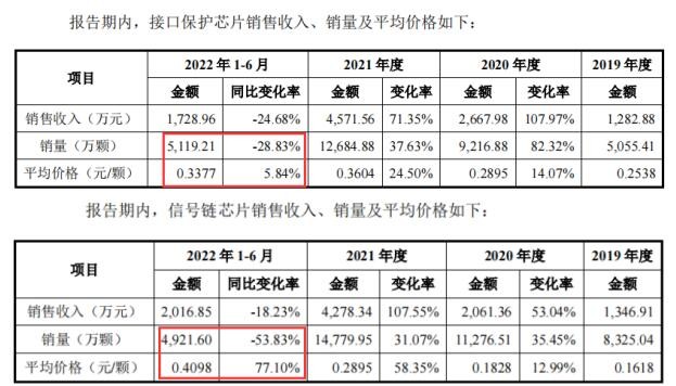 微源股份招股书披露,公司主要产品接口保护芯片与信号链芯片2022年1-6月出现上涨,销售价格分别为0.3377元/颗、0.4098元/颗,上涨幅度分别为5.84%和77.10%。虽然上述两款价格出现上涨,但是销量却出现下滑。公司接口保护芯片与信号链芯片2022年1-6月销量分别为5,119.21万颗、4,921.60万颗,同比2021年同期下滑-28.83%、 -53.83%。