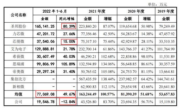 需关注的是,同行可比公司2022年1-6月营业收入均较2021年同期出现增长,增长幅度最大的为圣邦股份,增长幅度为80.39%,增长幅度最小的为艾为电子,增长幅度为15.00%。同行可比公司2022年1-6月营业收入平均增长率高达49.67%,而公司却反其道下滑12.84%。