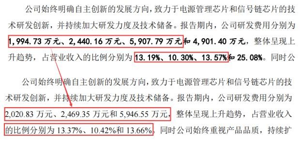微源股份经过多次问询,但是在问询回复中研发费用投入却存在不一致情况,令公司研发投入真实性存疑。