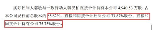 招股书披露,公司实际控制人与一致行动人蒋汉柏直接持有本公司4940.53万股,占公司发行前总股本的68.62% 直接和间接合计控制公司73.87%股份。需要注意的是,公司随之有披露,实际控制人与一致行动人蒋汉柏直接和间接合计持有公司75.75%股份,也就是说实际控制与一致行动人蒋汉柏直接和间接持有公司75.75%股份,却只控制公司73.87%股份。