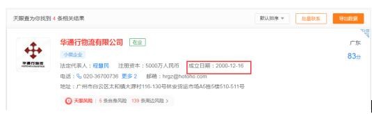 招股书披露,公司副总理、财务总监蒋汉柏在1998 至 2001 年任广州市华通行物流服务有限公司人财务经理。而天眼查显示,华通行物流服务有限公司成立时间为2000年12月16日,履历信息与实际情况出现不符。