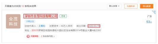 公司董事、副总经理邓以华在2001 年 3 月至 2007 年 8 月,在深圳市全茂科技有限公司任生产部副经理。而天眼查显示,深圳市全茂科技有限公司成立时间为2020年03月19日,董事、副总经理邓以华在深圳市全茂科技有限公司成立前19年便在该公司任职,甚是离谱。邓以华还在在2007 年 8 月至 2009 年 6 月在凯威集团鸿顺电子(深圳)有限公司任厂长,而查阅企业信用信息查询公示系统发行并无该公司。
