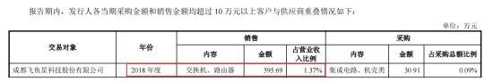 招股书披露,在报告期内公司各当期采购金额也销售金额均超过10万元以上客户与供应商重叠情况表中披露,2018年度公司对客户成都飞鱼科技股份有限公司销售交换机、路由器金额为595.69万元,占当期营业收入比例为1.37%。但是,公司对对客户成都飞鱼科技股份有限公司销售金额却遭到质疑。