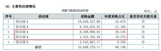 成都飞鱼科技股份有限公司为新三板挂牌公司,其在2018年发布年报显示,飞鱼科技对第四大、第三大供应商采购金额分别为425.47万元、850.81万元,与公司对其销售金额出现较大差异,差异高达上百万元,如此一来公司营业收入真实性便遭到质疑。