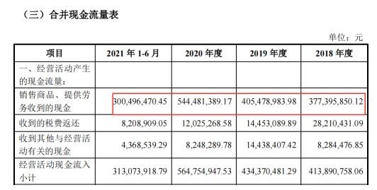 公司在现金流量表中披露,2018年至2021年1-6月销售商品、提供劳务收到的现金金额分别为37739.59万元、40547.90万元、54448.14万元和30049.65万元。同期,披露预收款项(合同负债)金额分别为392.97万元、584.53万元、473.54万元和1147.99万元,分别较上期增加-149.98万元、191.56万元、-110.99万元和674.45万元。因此,需要考虑其在现金流量中的影响,综合预收的影响,2018年至2020年1-9月流入与营收相关现金流金额约为37889.57元、40356.34万元、54559.13万元和29375.20万元。