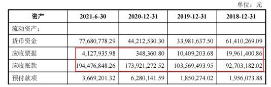据招股书披露,2018年至2021年1-6月应收票据分别为1996.14万元、1040.92万元、34.84万元和412.79万元,应收账款分别为9270.32万元、10356.95万元、17392.13万元和19447.68万元,无应收款项融资,则三项合计分别为11266.46万元、11397.87万元、17430.97万元和19860.47万元。分别较上期应收之和仅增加3457.49万元、131.41万元、6033.10万元和2429.50万元,分别较上述含税收入与现金流勾稽出的数据少了5458.69万元、4611.11万元、3767.11万元和2321.57万元。