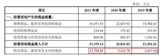 同星科技招股书披露,2019年至2021年公司对前五大供应商采购12185.98万元、14882.14万元、27152.40万元,分别占同期采购总额比为50.99%、47.23%、50.52%,由此可计算出公司采购总额分别为23898.76万元、31509.93万元、53745.84万元。根据13%进项税计算,则公司应支付含税采购金额分别为27005.60万元、35606.22万元、60732.80万元。