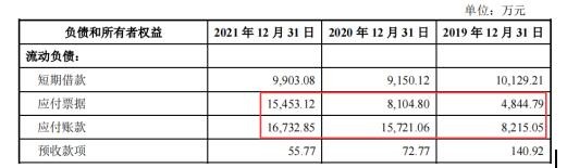 同星科技招股书披露,2019年至2021年,公司应付票据金额分别为4844.79万元、8104.80万元、15453.12万元,应付账款分别为8215.05万元、15721.06万元、16732.85万元,应付票据及应付账款合计分别为13059.24万元、23825.86万元、32185.97万元,分别较上期增加3354.36元、10766.62万元、8360.11万元。分别与应形成债务金额之差分别为18550.82万元、15425.34万元、18522.36万元。