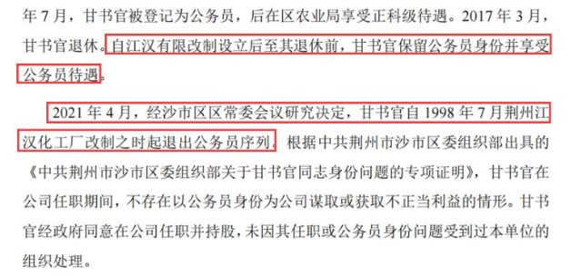 除实控人卷入行贿案之外,公司实际控制人在退出公务员序列之后,至其退休前,甘书官保留公务员身份并享受公务员待遇。而需关注的是,2021 年 4 月,经沙市区区常委会议研究决定,甘书官自 1998 年 7 月荆州江汉化工厂改制之时起退出公务员序列。