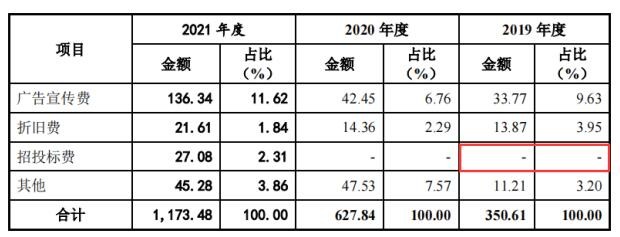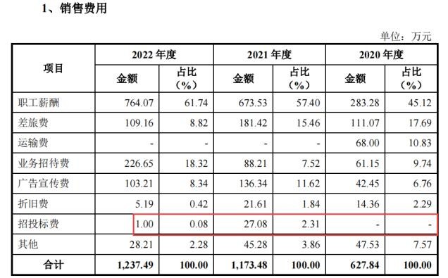 招投标费用一般计入在销售费用之中,朗坤环境招股书披露2020年至2022年销售费用分别支出627.84万元、1173.48万元、1237.49万元,呈现逐年增长之势,这与公司营业收入增长相匹配。在销售费用中,朗坤环境披露2020年至2022年招投标费用分别为0元、27.08万元、1.00万元,由此可知2020年公司并未有招投标费用支出,也说明2020年公司没有出现招投标项目。