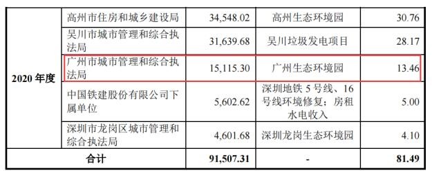 朗坤环境招股书披露,广州市城市管理和综合执法局2020年成为公司第三大客户,公司通过广州生态园对广州市城市管理和综合执法局实现营业收入为15115.30万元,占当期营业收入比为13.46%。