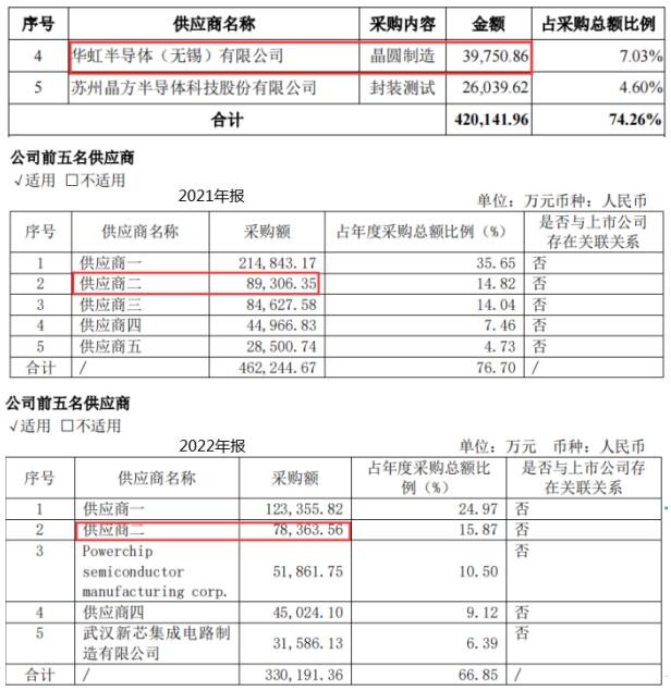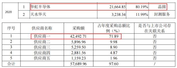 苏州东微半导体股份有限公司为科创板上市公司,其招股书披露2020年对华虹半导体有限公司采购晶圆金额为21664.85万元,占当期采购80.19%,与华虹半导体披露对其销售金额之差为281.39万元。2021年,东微半导年报披露,当期对第一大供应商采购金额为42492.71万元,与华虹半导体披露对其销售金额之差为498.77万元。