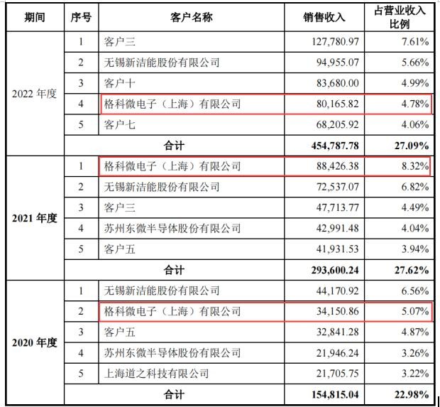 华虹半导招股书披露,2020年至2022年对客户格科微电子(上海)有限公司销售金额分别为34150.86万元、88426.38万元、80165.82万元,分别为公司第二、第一、第四大客户,占当期营业收入比分别为5.07%、8.32%、4.78%。